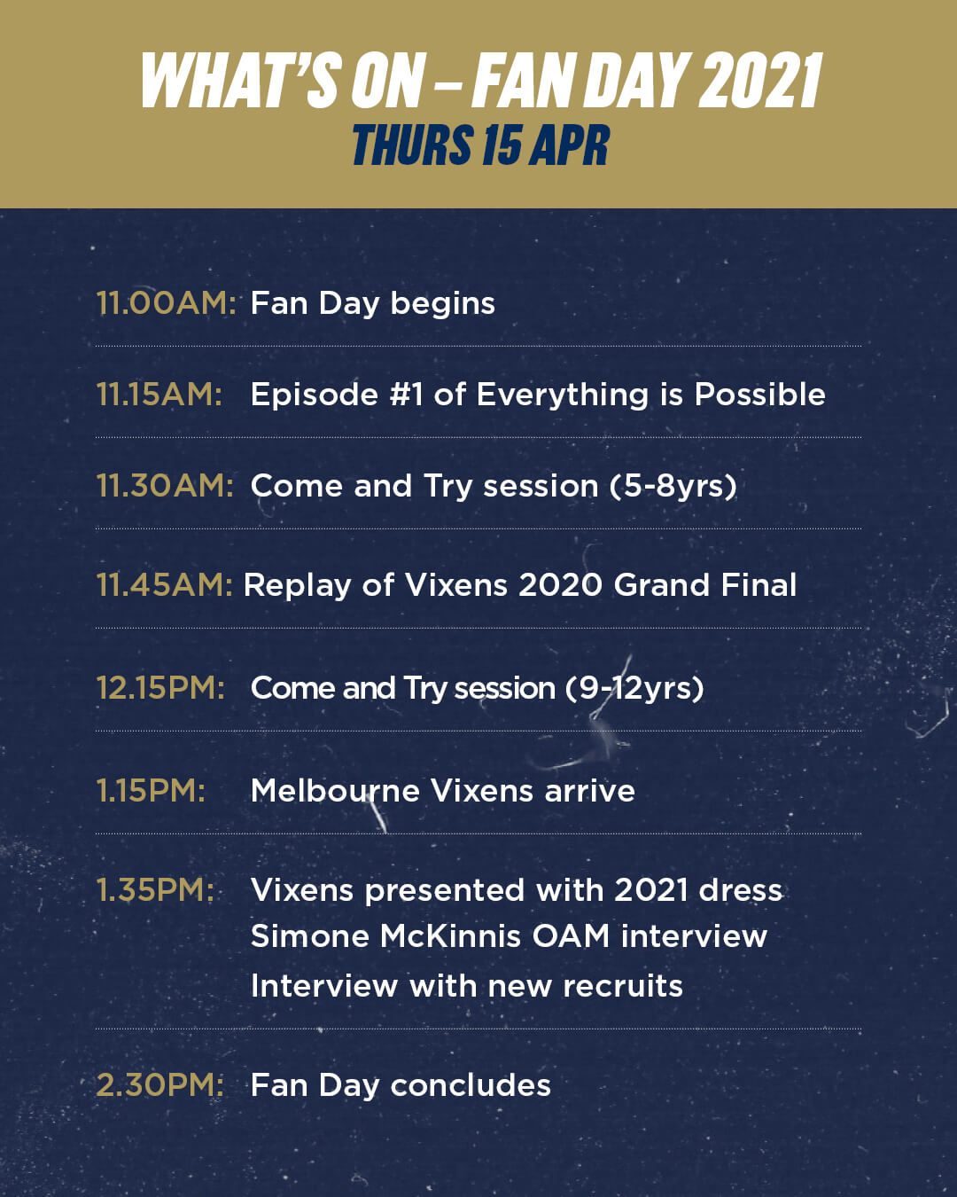 We hope you are enjoying your school holidays. Just letting you know that at the Melbourne Vixens Fan Day tomorrow we’ll be holding a free come and try session!