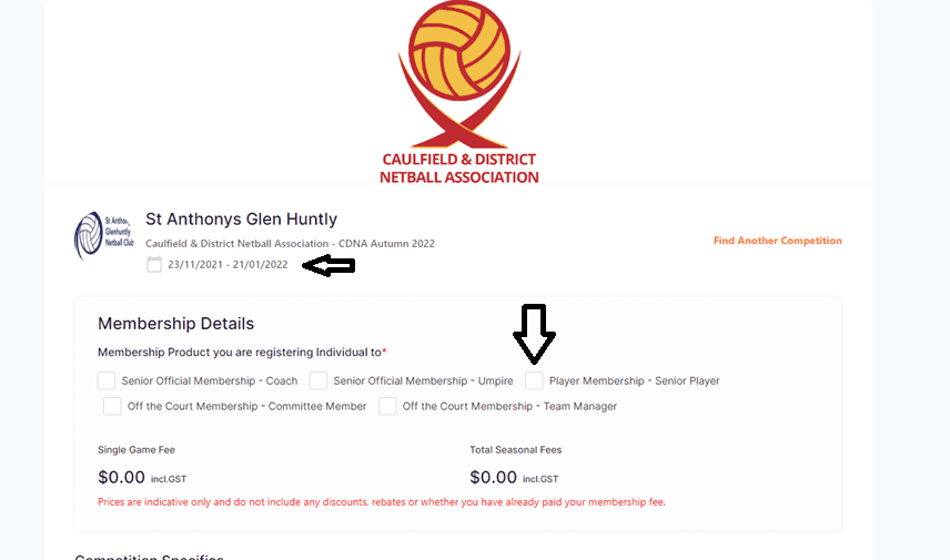 Note:- Please select 'Full Competition - Upfront' not Single Game - this is a flow-on from CDNAs set up for Single Game Vouchers and does not apply to our registrations.