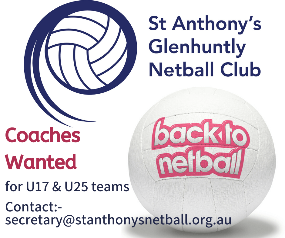Expressions of interest or further information to secretary@stanthonysnetball.org.au or phone 0431 633 084